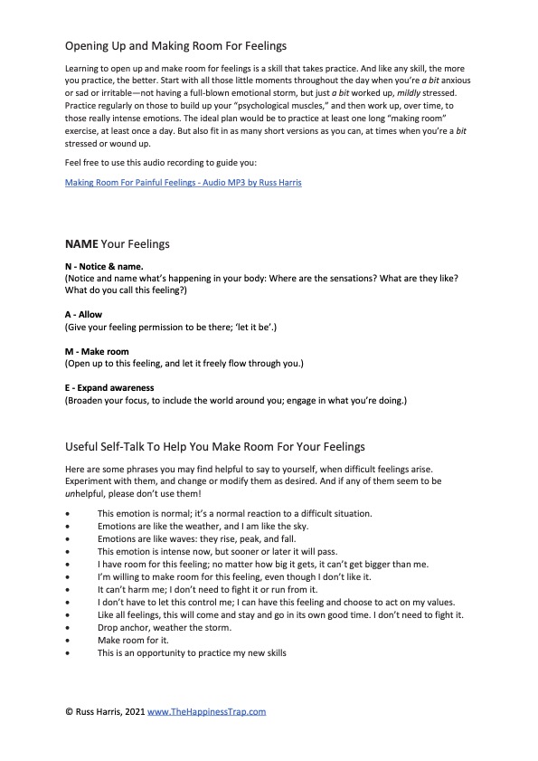 Russ Harris has a number of FREE tools on Acceptance and Commitment Therapy, this is one of my favorites.