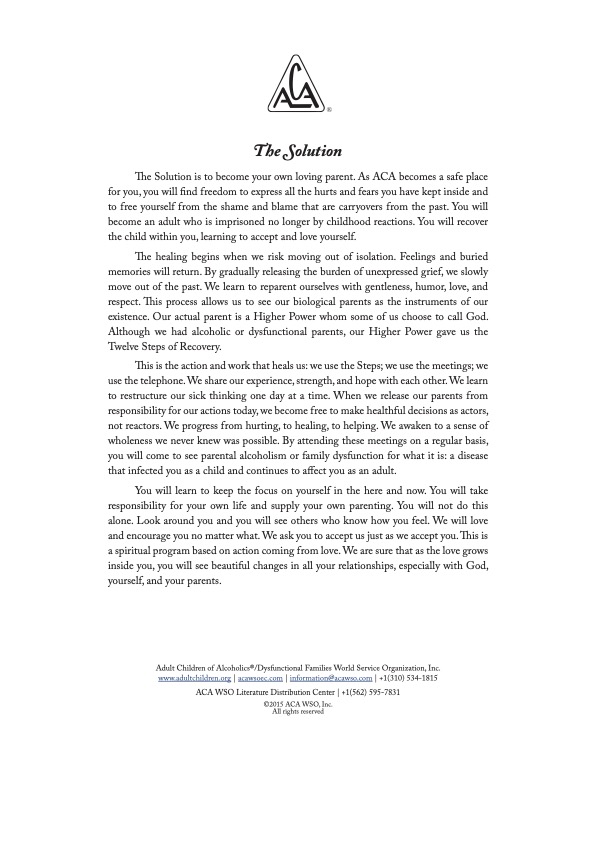 Adult Children of Alcoholics (ACA) is a 12 Step Program focused on supporting individuals raised by alcoholics who wish to heal patterns and become their own loving parent.